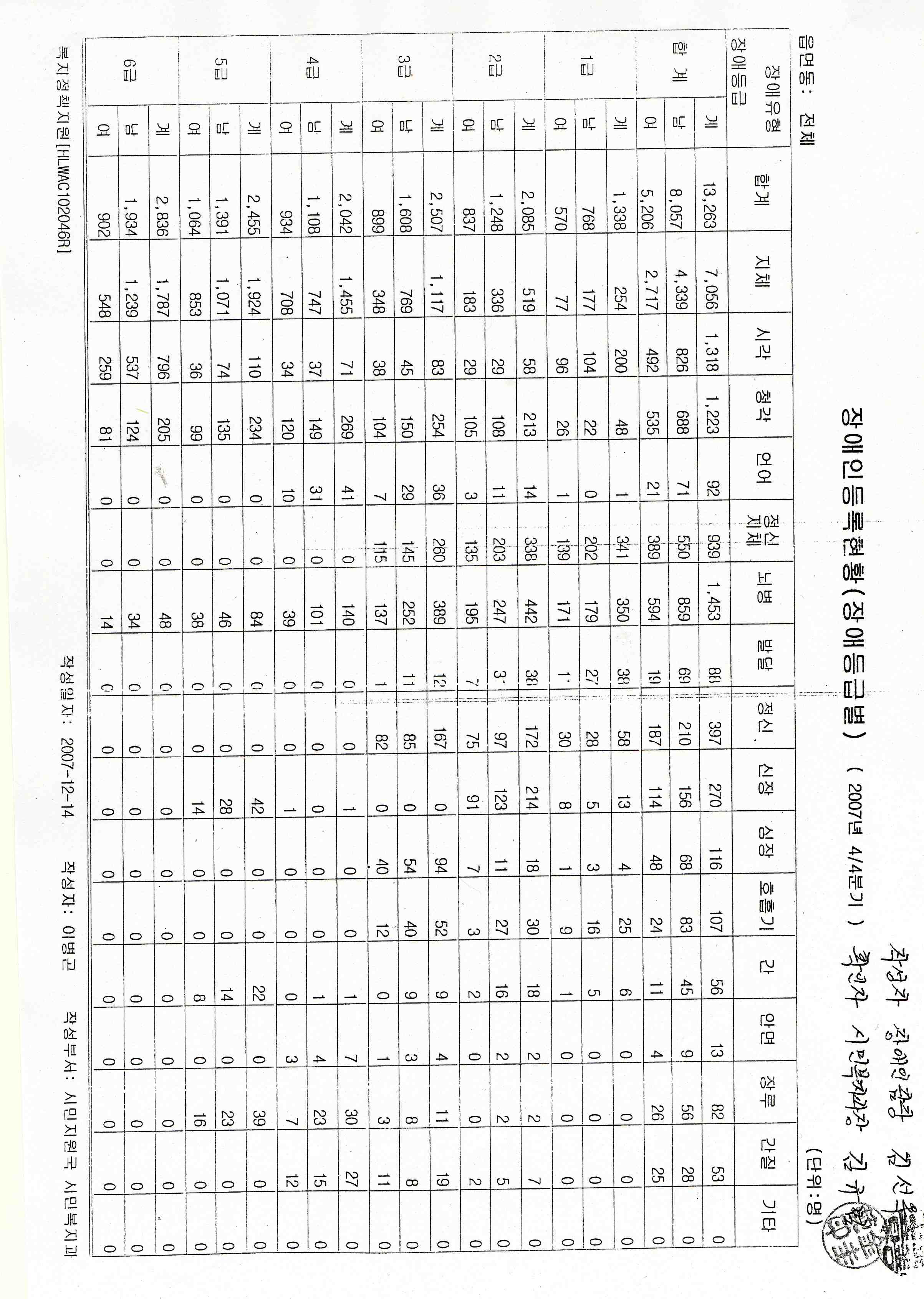 다음은 金暘起 위원님께서 장애인 수당지원 내역과 관련해서 등급별로 세부내역을 요구하셨습니다.