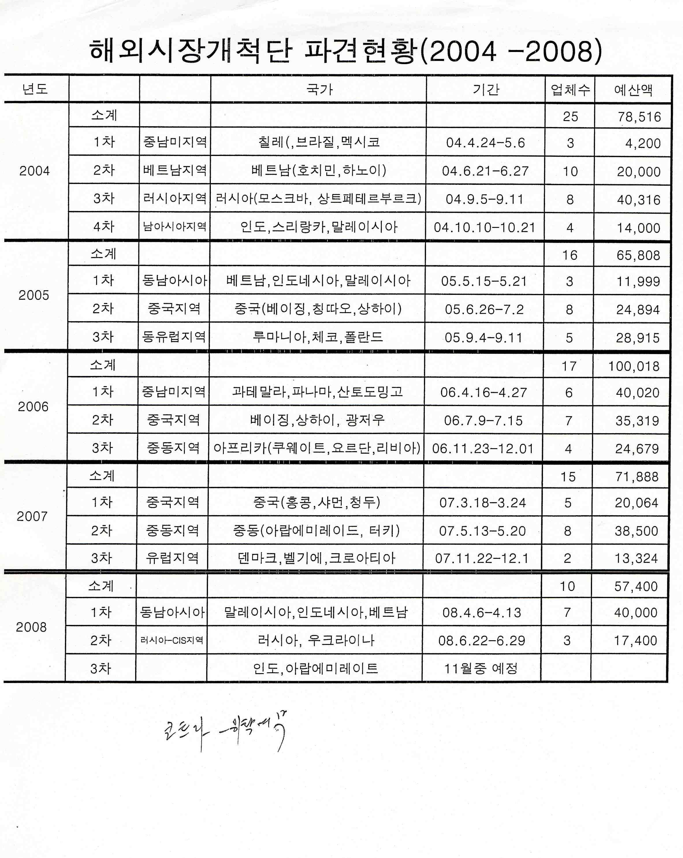 2004년부터 2008년까지 5년동안 해외시장개척단 파견실적과 11월 파견내용은 별도로 위원님들 좌석에 배부해드렸습니다.