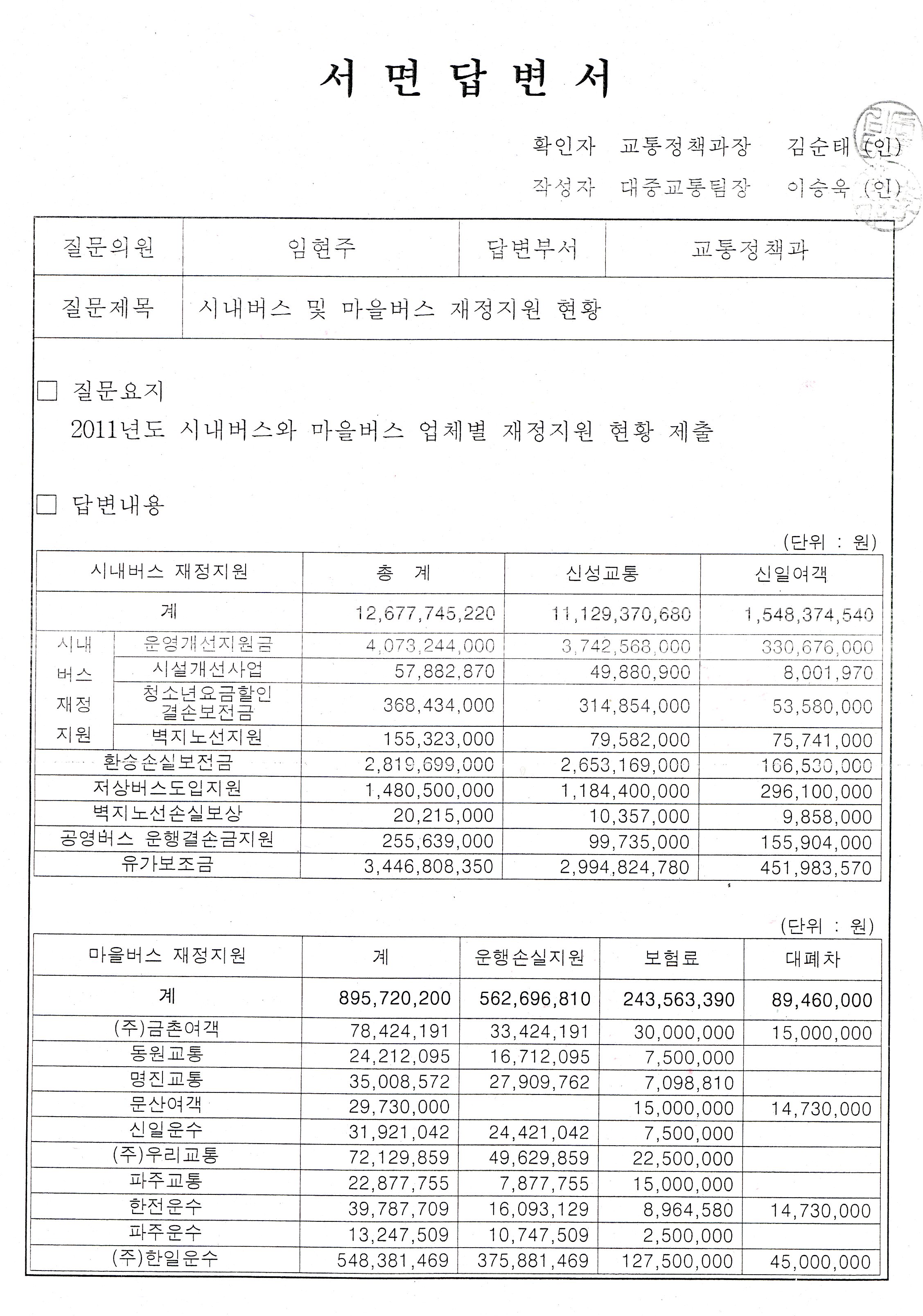예산안 379쪽 보면 벽지노선 손실보상 지원, 시내버스 재정지원, 수도권 환승할인 손실보전 등등 있는데 파주시 관내 교통회사에 지급하는 손실보조금을 말하자면 환승할인, 벽지노선, 공영버스 손실보전금, 유가보조금 등등해서 버스회사별 내역별 손실보상총액을 산출해 주시기 바랍니다.