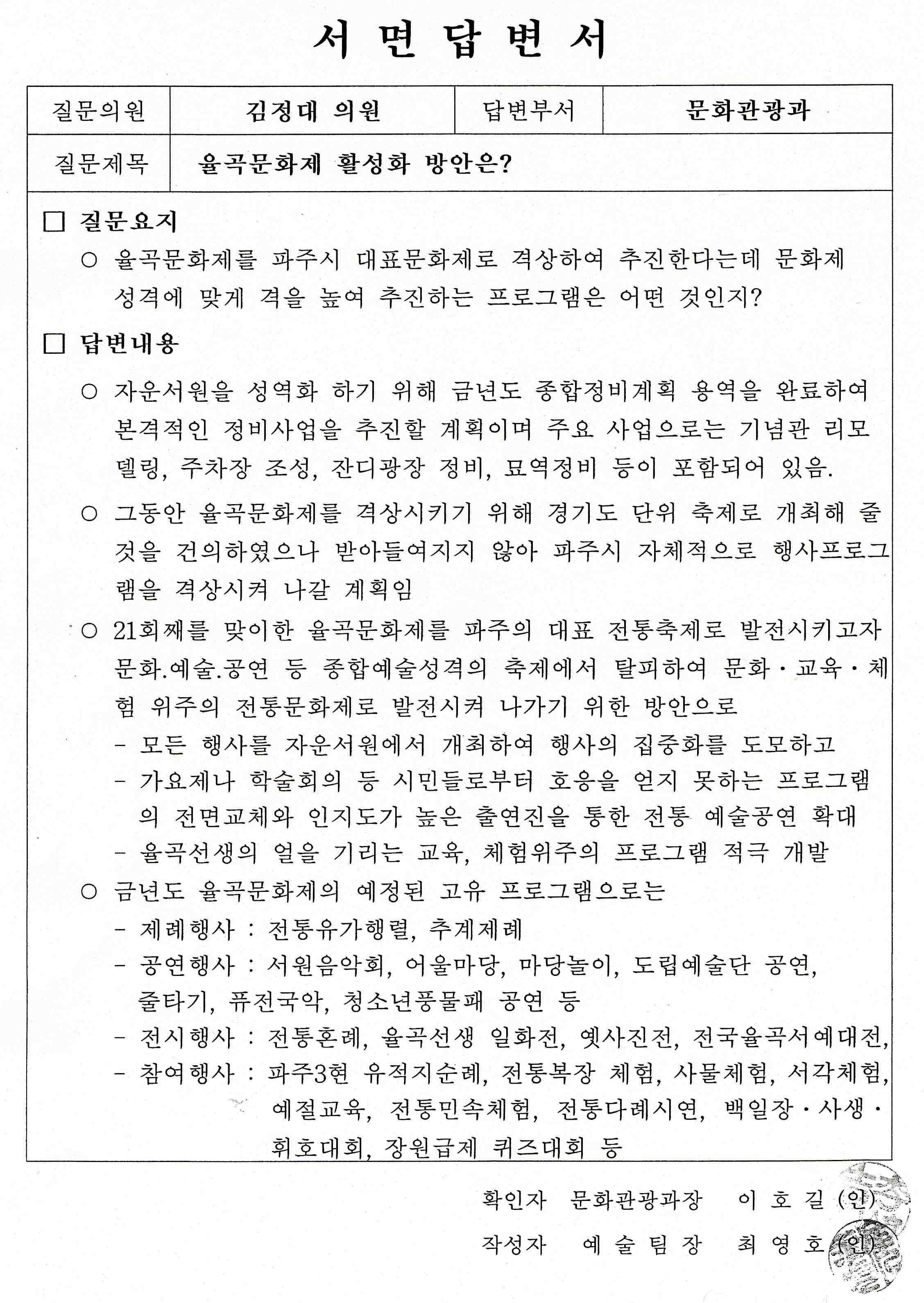 ○ 金正大 위원 작년도에 율곡문화제 하면서 의회나 시에서 계획이 율곡문화제를 파주의 전통문화제로 격상을 시키겠다 이렇게 얘기를 하셨습니다.