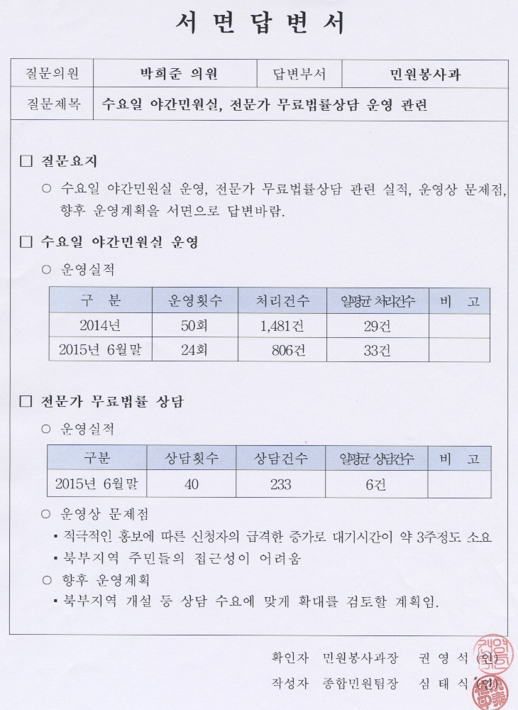 다음은 민원봉사과 소관 주요업무추진상황 39페이지 정부민원포털 민원24 운영에 대한 자세한 설명과 전문가 무료 법률 상담, 수요일 야간민원실 운영하고 있는데 현재까지 운영실적과 향후 운영계획, 문제점 등을 서면으로 제출하여 주시기 바랍니다.