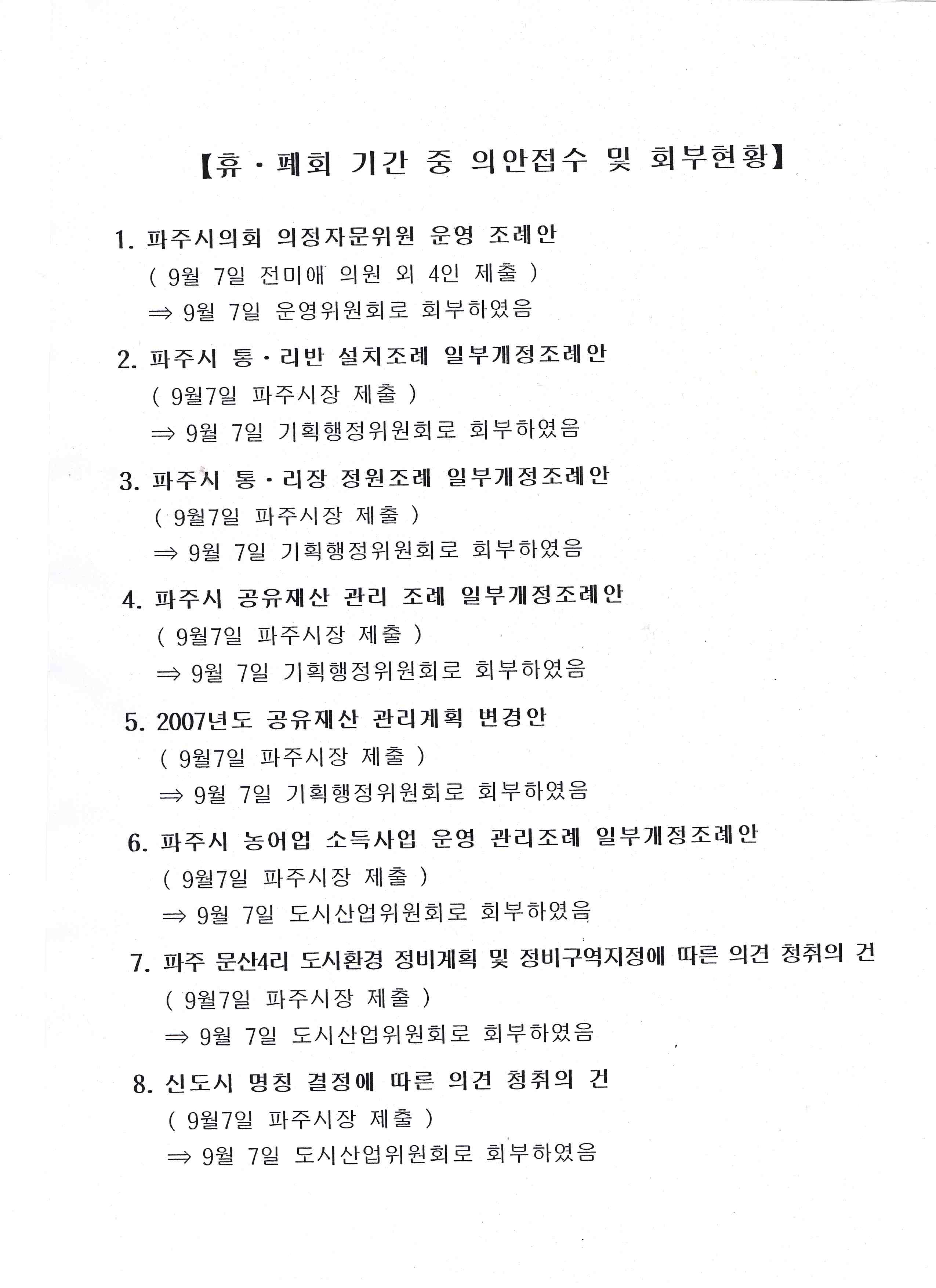 9월 7일 파주시 통·리·반 설치조례 일부개정조례안 등 7건의 안건이 접수되어 같은 날 해당 상임위원회로 각각 회부하였습니다.