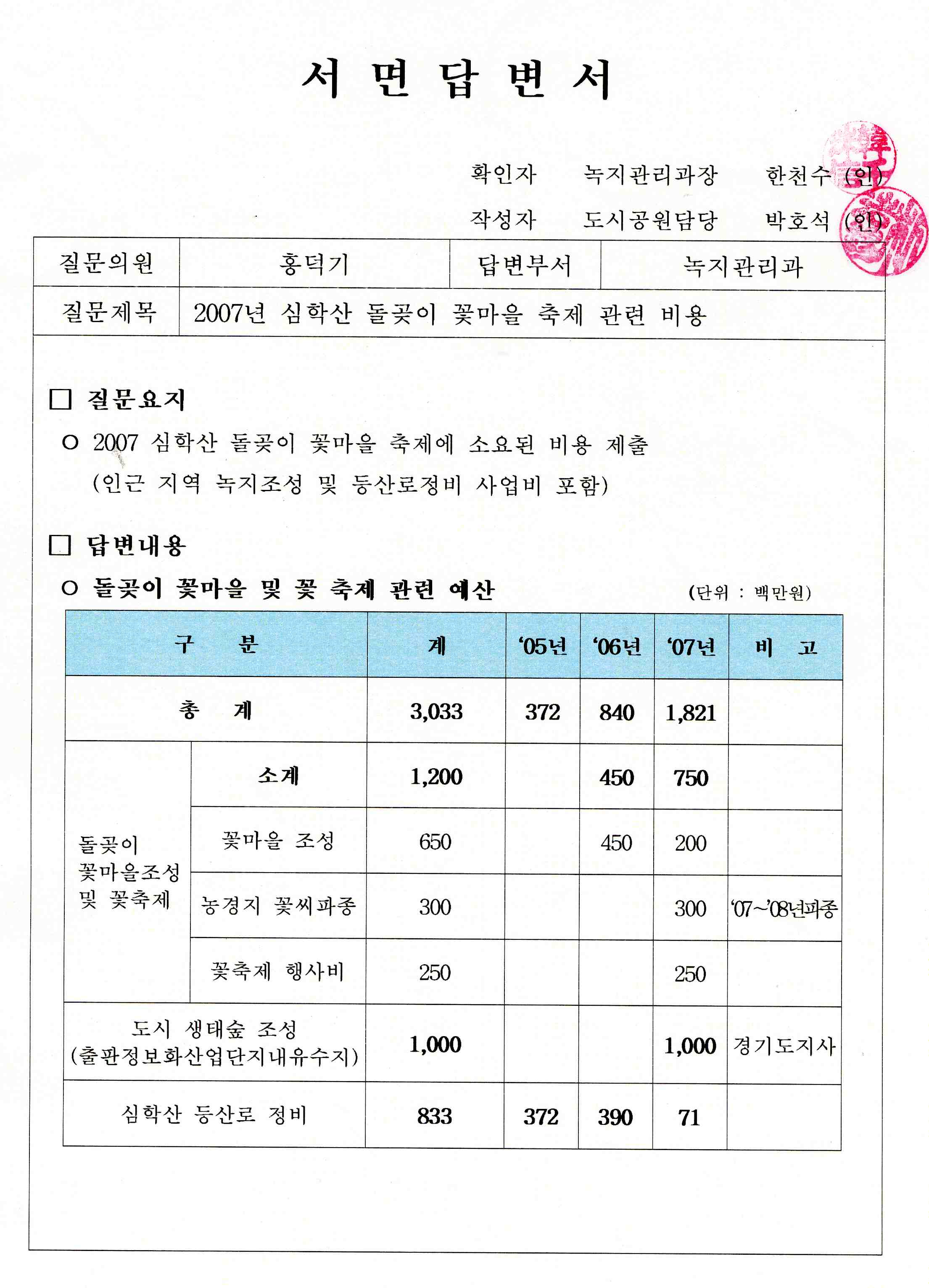 ○ 洪德基 위원 끝으로 저희가 질의한 심학산 관계에 대해서 자료를 서면으로 제출부탁드리겠습니다.