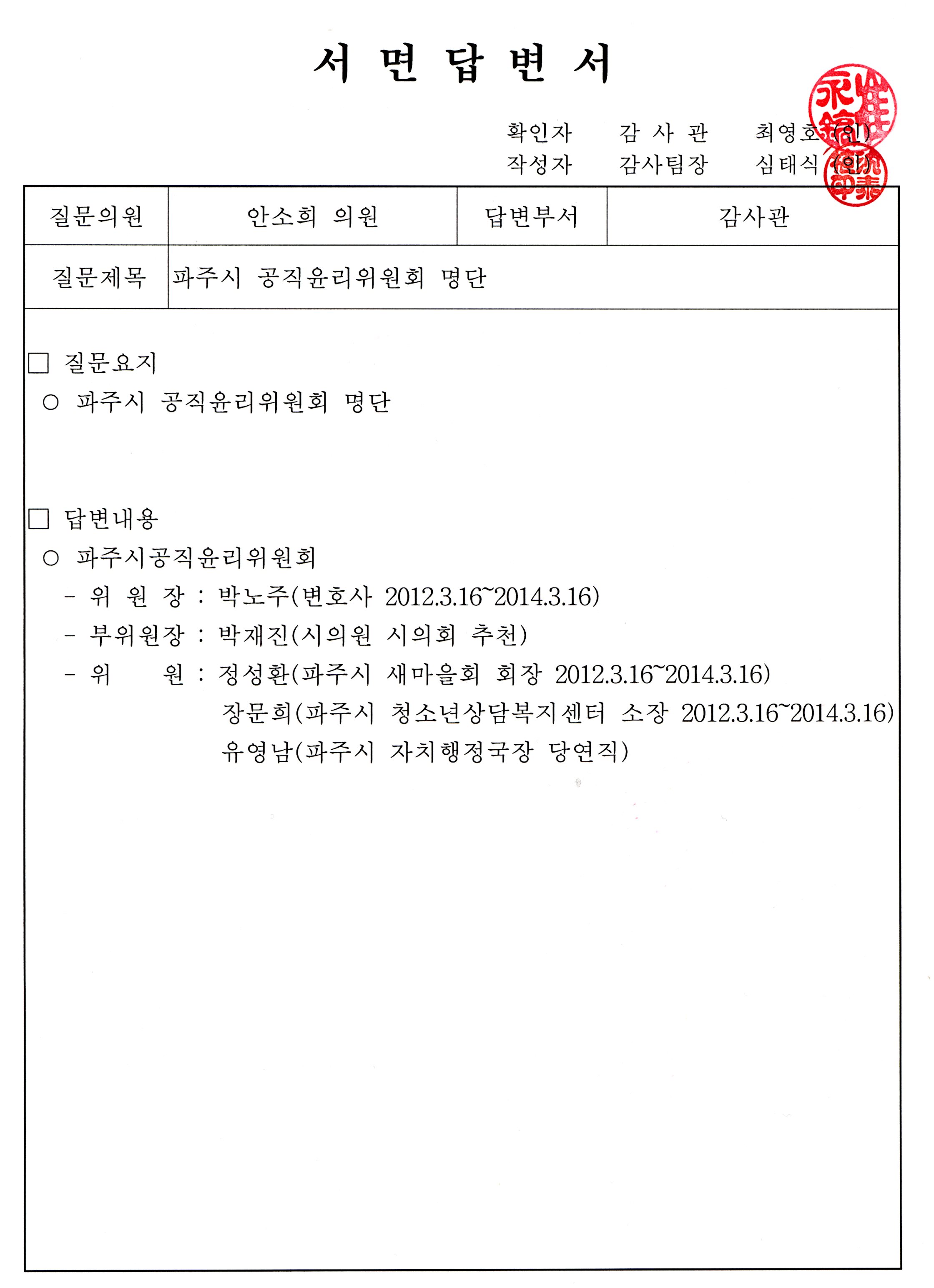 본인은 파주시의회가 지방자치법 제41조, 동법시행령 제39조, 파주시의회 행정사무감사 및 조사에 관한 조례 제2조 규정에 의하여 기획행정위원회 소관업무에 대한 2013년도 행정사무감사를 실시함에 있어 성실하게 감사를 받을 것이며 또한 증인으로서 증언함에 있어서는 지방자치법 시행령 제43조제6항과 파주시의회 행정사무감사 및 조사에 관한 조례 제14조의 규정에 의하여 양심에 따라 숨김과 보탬없이 사실 그대로 말하고 만일 진술이나 서면답변에 거짓이 있으면 위증의 벌을 받기로 맹세합니다.