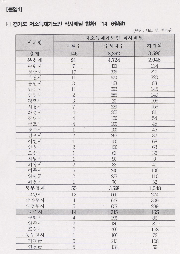 다음은 경제복지국 소관 사회복지과 280쪽, 저소득 재가노인 식사배달사업 관련해서 경기도 31개 시군 지원 현황을 경기도를 통해서 자료를 받아서 제출해 주시기 바라고요.