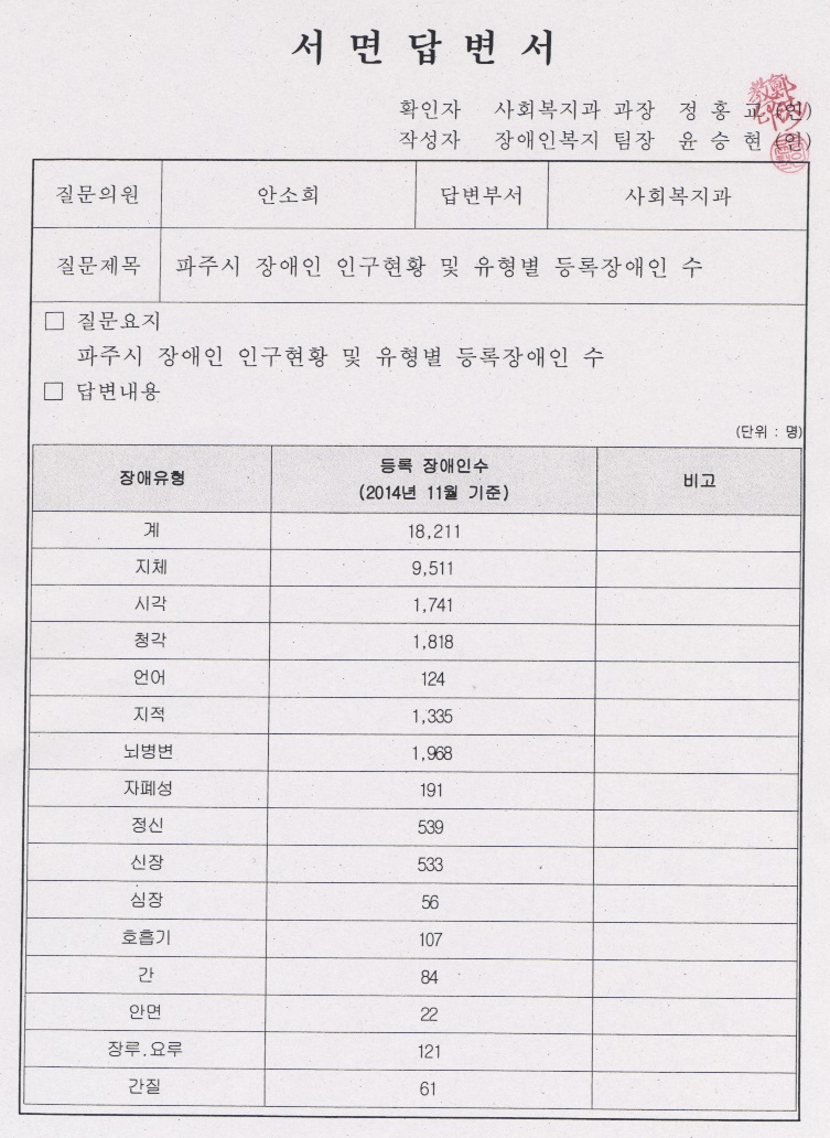 덧붙여서 장애인팀에서는 현재 파주시 장애인 인구현황 및 장애 유형별 등록 장애인수를 자료로 제출해 주시기 바랍니다.