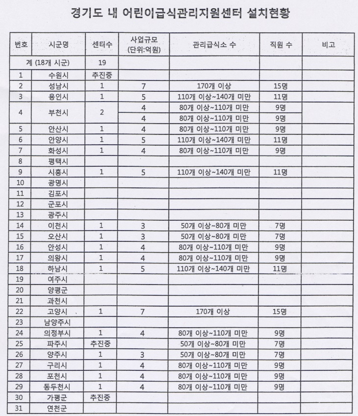 그러면 나머지 10개 시군은 여전히 급식관리지원센터가 설치 안되어 있는 상태에서 운영됩니다, 그래서 법에는 그렇게 규정되어있지만 국가에서 예산이 따르지 못하기 때문에 부득이 지원 못하고 있는 것인데 저희도 마찬가지로 예산이 충분치 못해서 지원 못하고 그것을 따르려면 국고지원도 받아야 되는데 국고에서 그만큼 아직 여력이 안되기 때문에 그러니까 국비지원을 필요한 숫자만큼 지원받을 수 있도록 노력하고 거기에 맞춰서 시비도 매칭해서 결국 궁극적으로는 법에서 요구하는 대로 다 법정인원수에 적합하게 해야 되는 것이 원칙이고 맞는 것인데 현실적으로 그렇지 못한 한계가 있는 것이고 다만 저희입장에서는 직접 가서 지도하는 것은 한계가 있겠지만 정보를 제공하거나 서비스는 전체 급식소를 대상으로 지원할 예정입니다.