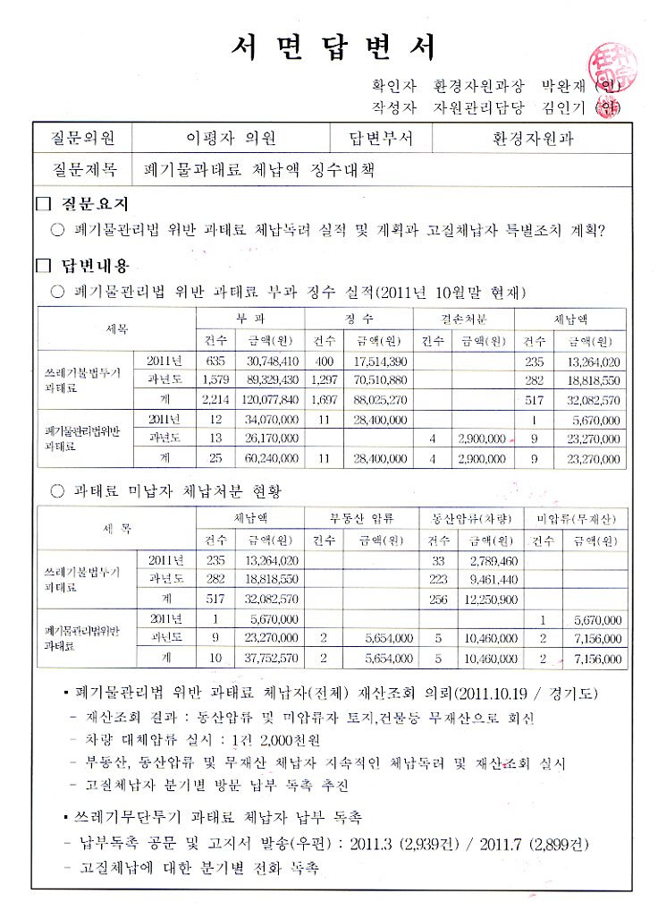 우리시는 그동안 환경부 예규의 과태료 부과기준을 조례상 정해서 운영해 왔으므로 폐기물관리법 시행령에 따라 운영되더라도 특별한 문제점이 없습니다.