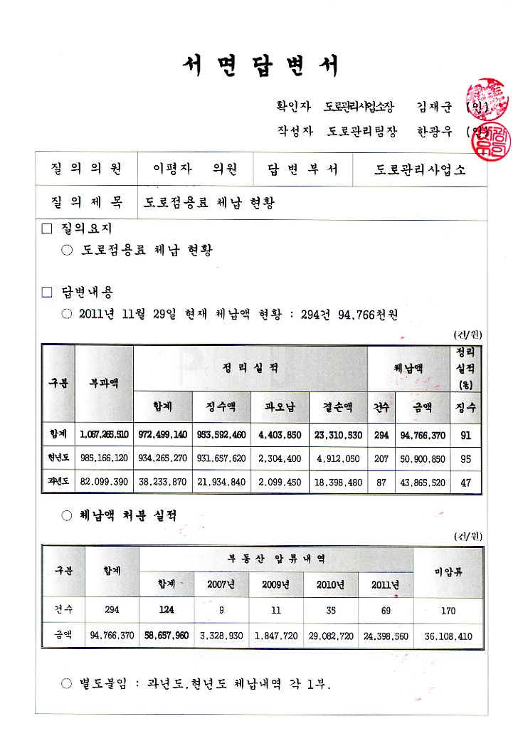 ○ 김양기 위원 먼저 도로점용료에 대해서 말씀 드리겠습니다.