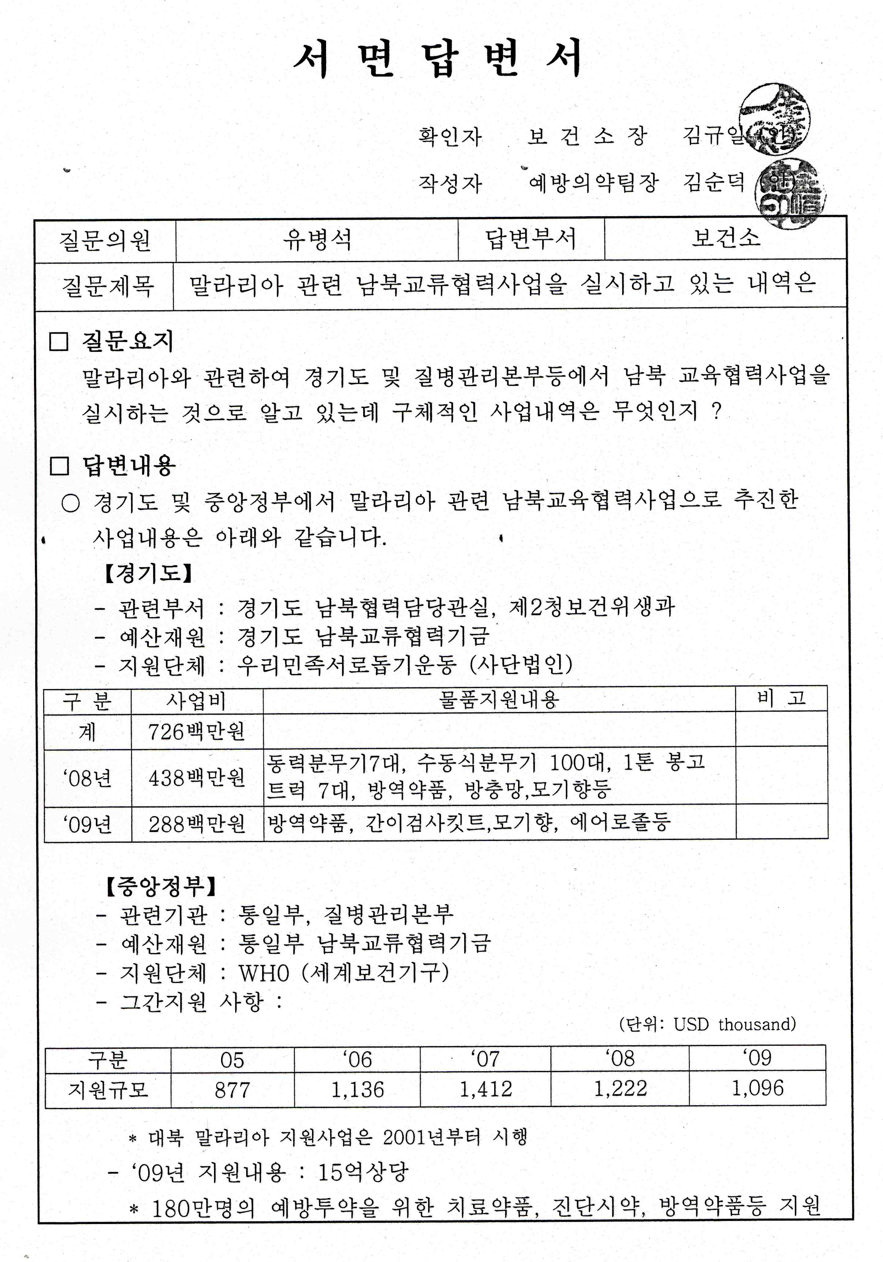 金正大 위원님께서 질의하신 올해 말라리아 사업비로 5억 400만원이 편성되었는데 내년도 방역사업계획 내용이 올해와 달라지는 사업내용이 있는지 물으셨으며 아울러 2005년부터 2009년까지 연도별 말라리아 발생현황과 올해 민간위탁방역 추진내역에 대하여 물으셨습니다.