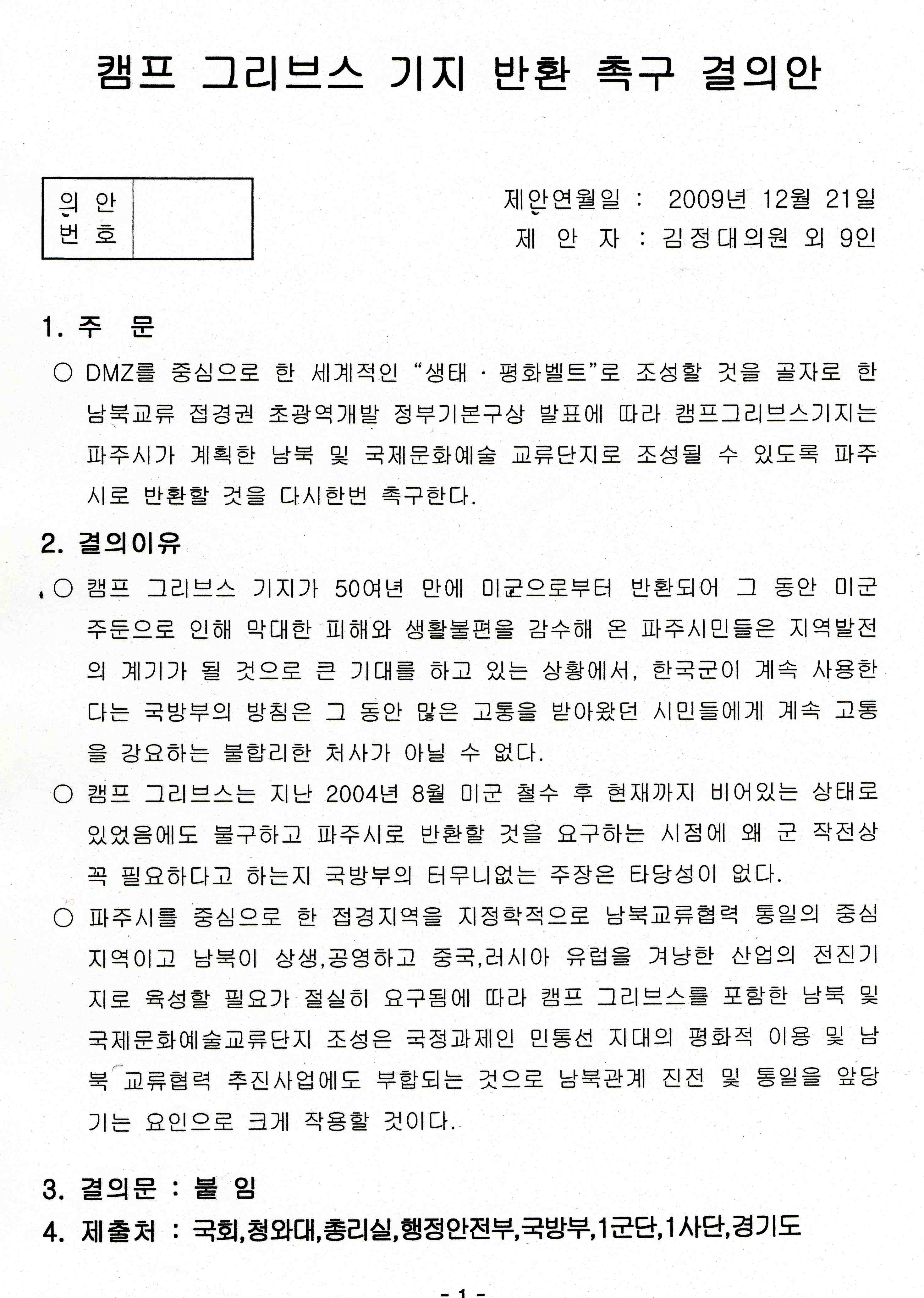 이에 33만 파주시민의 대변자인 우리 파주시의회는 캠프 그리브스 기지에 한국군을 이전 배치하려는 국방부의 계획을 즉각 철회하고 DMZ를 중심으로 한 세계적인 생태평화벨트로 조성할 것을 골자로 한 남북교류접경권 광역개발 정부기본구상을 적극 수용하고 파주시민의 품으로 반환할 것을 다시 한번 강력하게 촉구한다.